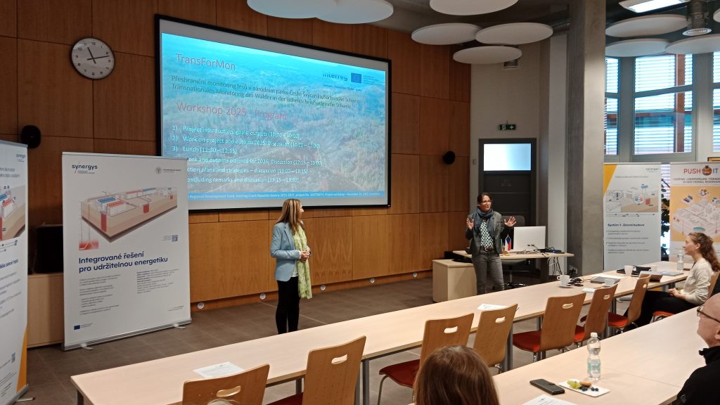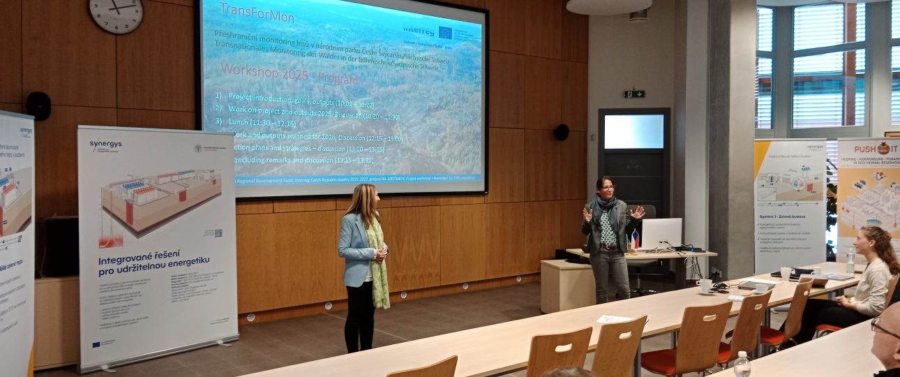 On 26 November 2025, the first cross-border workshop of the Interreg project TransForMon took place in Litoměřice. Representatives of scientific institutions from Charles University Prague and TU Dresden, as well as national park administrations, came together to discuss the project’s achievements to date and future work. The programme included the presentation of the new publicly accessible TransForMon web portal, an insight into the created data catalogue, which mainly contains orthophotos and aerial photographs of Bohemian and Saxon Switzerland dating back to the 1950s, and the database on forest projects that have taken place in the two national parks, as well as reports on current and future UAV and botanical data collection.